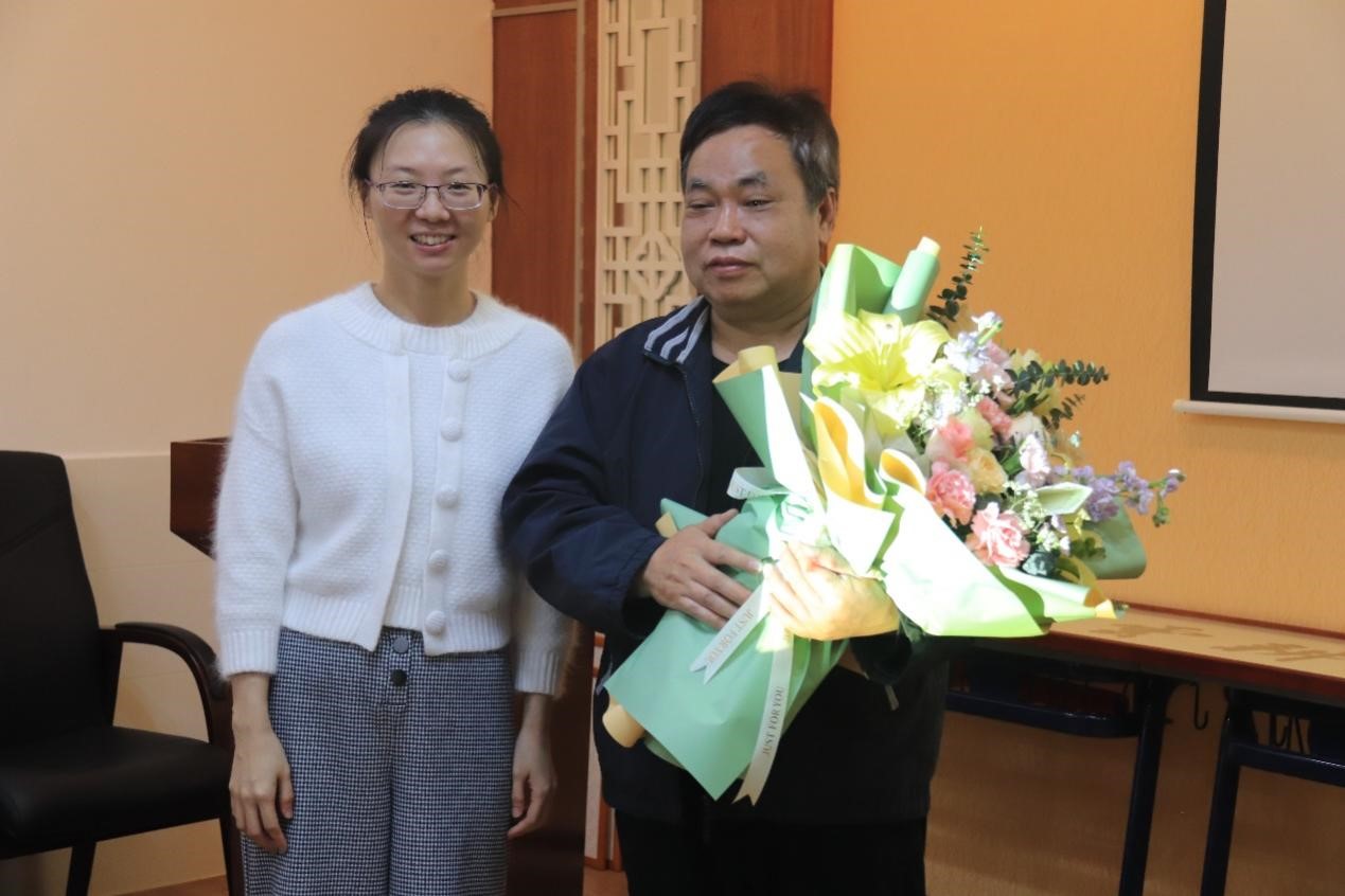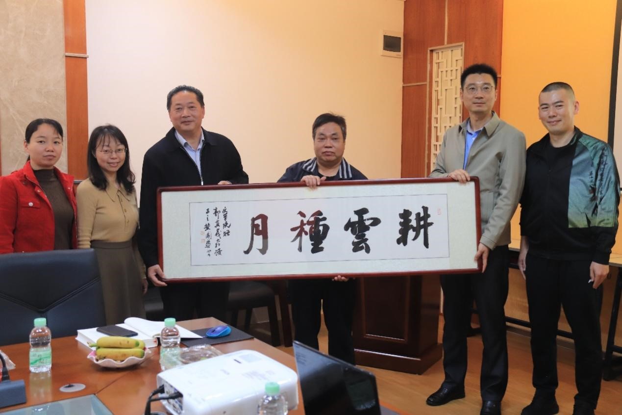 随后,我院古代文学教研室主任陈文婷代表我院向郭真义老师献上鲜花和祝福,学院领导为郭真义老师献上字画“耕雲種月”并合影留念。