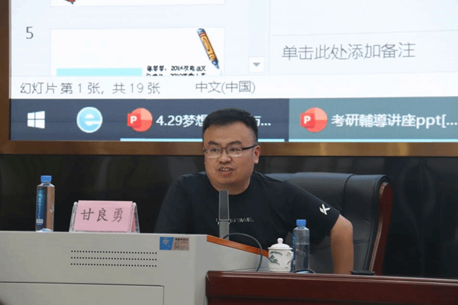讲座伊始,甘良勇就“为什么要考研”这一问题进行阐述。首先他就以大学已不是精英型教育这个现象,来阐述大学生过多这个问题,因此获取硕士学位成为了当下融入主流社会的最普遍通行证。接下来他用三个方面解释了考研的优势在哪里:一是社会竞争加剧,高学历才能在职场中抢占先机;二是就职以后,在职称晋升和职务提拔中都有明显的优势;三便是欣赏不同的人生风景,他认为人生最宝贵的是经历,去新的地方、新的环境都会使人受益匪浅。