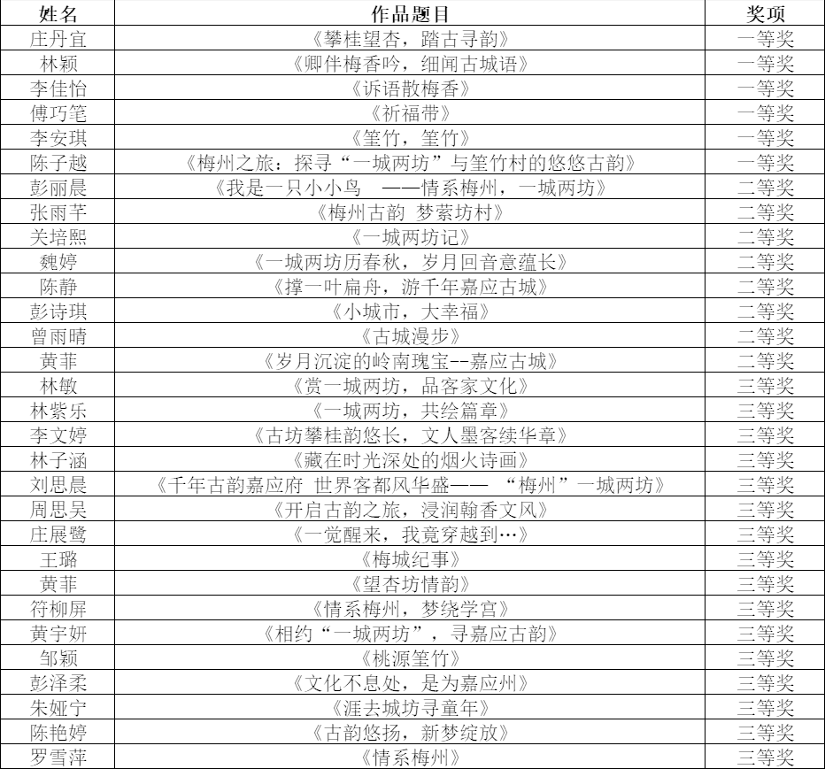 近日,梅州“一城两坊”首届征文大赛圆满结束。经过专业老师评比, 《攀桂望杏,踏古寻韵》等30部作品荣获各级奖项。此次活动以赛代练,激发了同学们书写梅州美景的热情,宣传了梅州深厚文化底蕴,提升了同学们专业写作能力,大赛达到了各项预期目标。恭喜以下获奖同学!