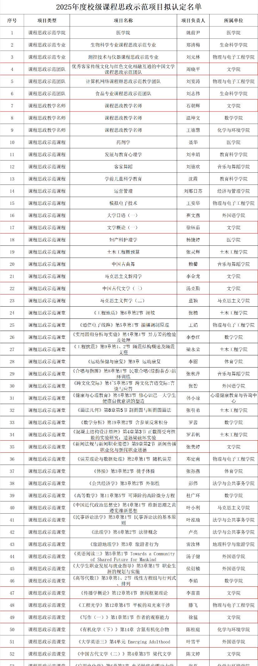 此次获评项目涵盖团队、名师、课程、课堂等多个层面,充分体现了我院课程思政建设的系统性与全面性,周晓平老师负责的“优秀客家传统文化与红色文化相融互通的中国文学课程思政示范团队”,扎根地方文化、融合红色基因,探索出特色鲜明的文化育人路径;石朝辉老师荣获“课程思政教学名师”称号,彰显了我院教师在立德树人方面的示范引领作用;《文学概论(一)》(徐钰茹)《马克思主义新闻学》(李金龙)《中国古代文学(三)》(汤克勤)等三门示范课程,覆盖文学理论、新闻传播、古典文学等多领域,实现了价值塑造与知识传授的深度融合;而《新闻法规与新闻职业道德》(张美婷)《传播学概论》(李苗苗)《写作(一)》(徐猛)《中国古代文学(二)》(陈文婷)等四个示范课堂,则在具体教学环节中精准融入思政元素,切实做到“课课有思政、节节育人心”。