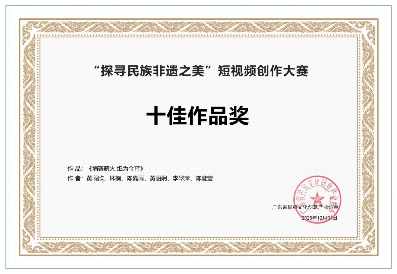近期,我院学子黄雨欣、陈嘉雨、黄丽娴、李翠萍、陈慧莹凭借微纪录片《埔寨薪火 纸为今宵》,在广东省“探寻民族非遗之美”短视频创作大赛、“粤来粤好百千万”拍客大赛以及粤港澳大湾区大学生艺术节中接连斩获三项荣誉,充分展现了我院学子扎实的专业素养与深厚的文化情怀。
