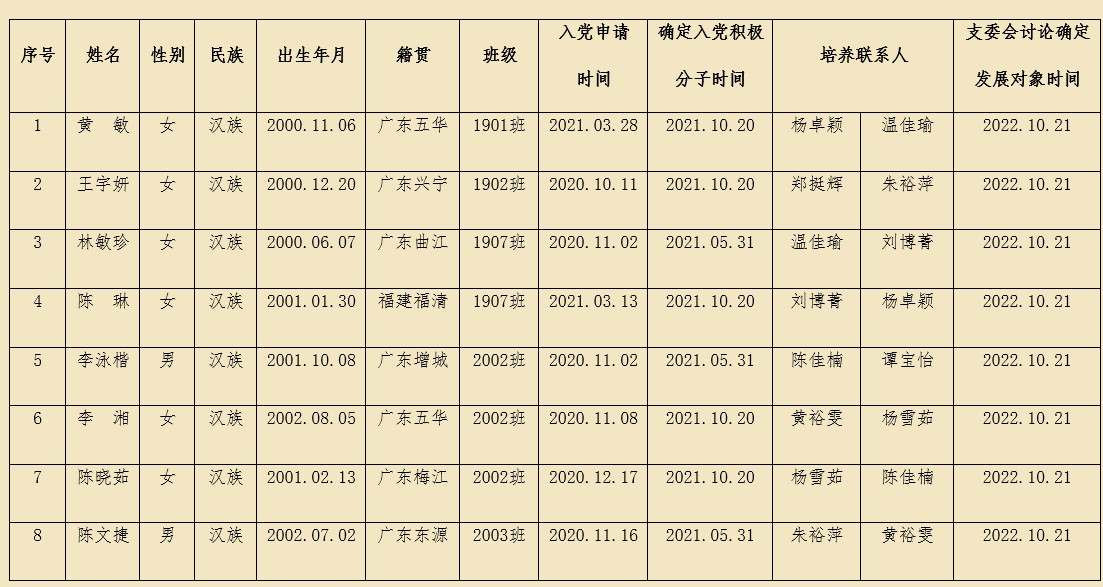 按照发展党员工作有关规定,经党支部委员会研究,确定黄敏等8名同志为发展对象人选。现将有关情况公示如下:
