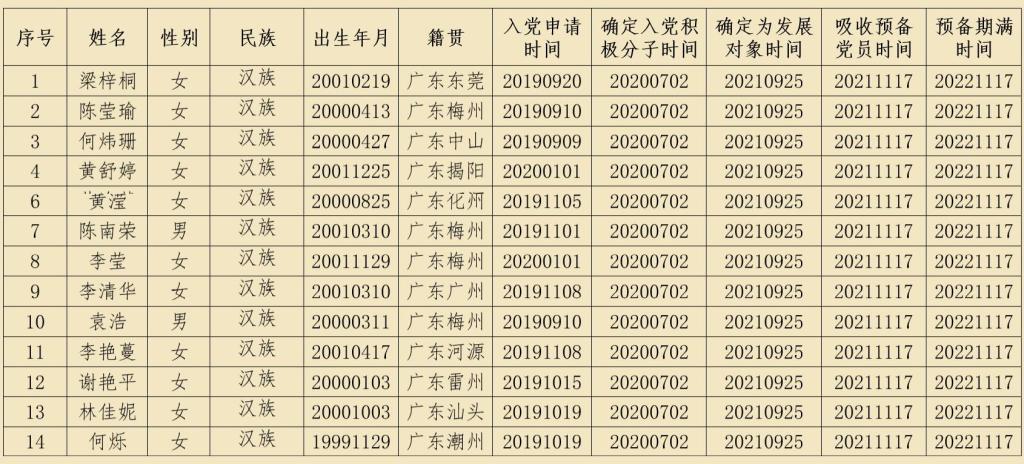 按照发展党员工作有关规定,在听取党小组和党员、群众意见的基础上,经党支部委员会审查,党支部拟于近期召开党员大会讨论将梁梓桐等14名同志转为中共正式党员,现将有关情况公示如下: