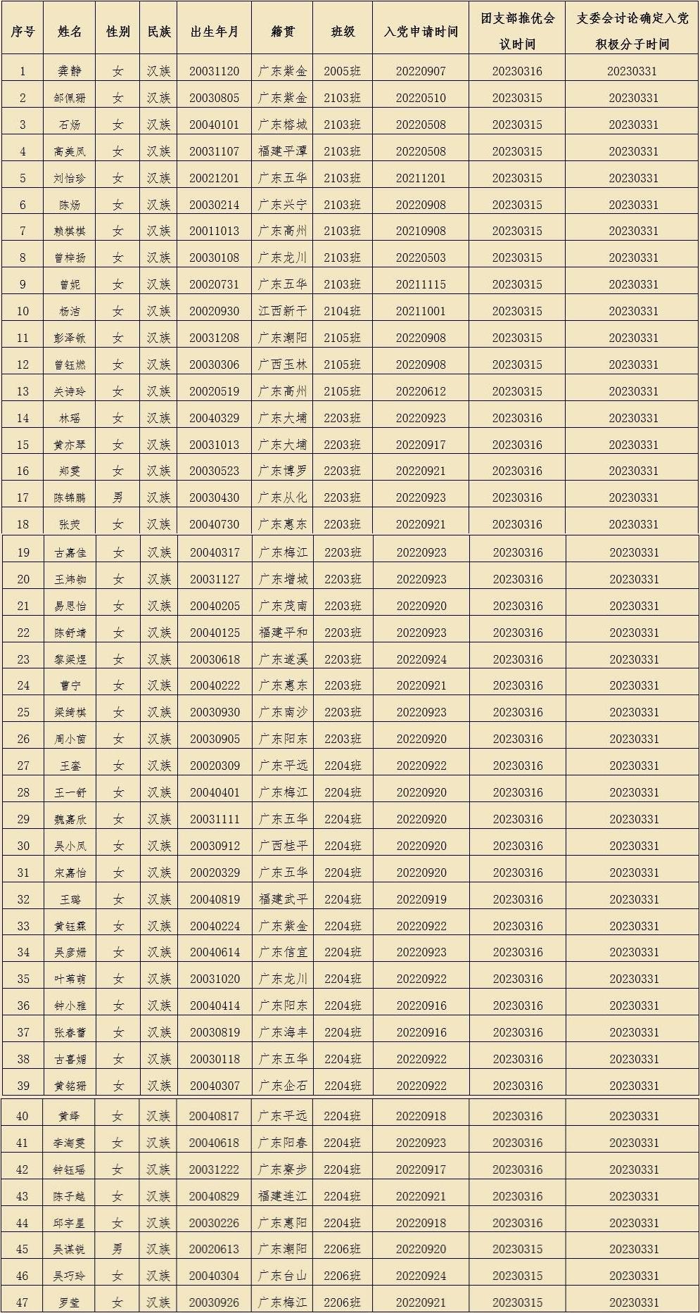 按照发展党员工作有关规定,根据群团组织推优情况,经支部委员会研究,确定龚静等47名同志为入党积极分子。现将有关情况公示如下: