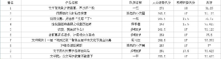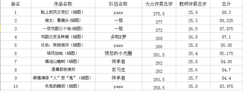 评委老师由yl6809永利集团永利集团办公室组织老师评审得出成绩,大众评委由每个班级派出2名同学组成。成绩公示期为6月2日—5日,各队伍如对成绩产生异议,请及时向新闻部反映情况。